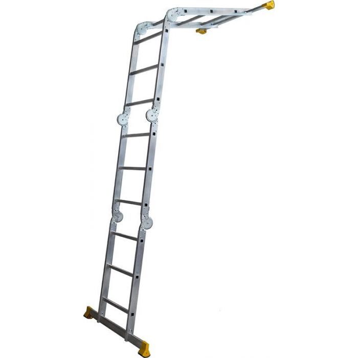 Лестница состоит из четырех секций, соединенных между собой стальными лестничными шарнирами с углами фиксации 35, 105 и 180 градусов. Поэтому такая лестница может принимать различные формы, такие как на рисунке.