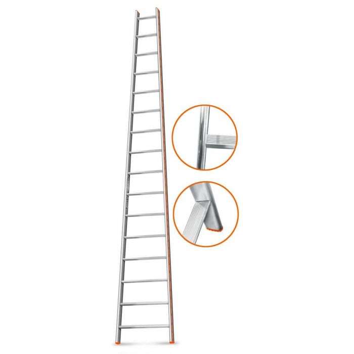• Ступени выполнены из нескользящего профиля шириной 63 мм с глубокой насечкой. Ступени располагаются строго горизонтально при приведении лестницы в рабочее положение, т.е. расположены под углом к направляющим. Комфортная работа на лестницах с широкими ступенями ощущается при длительной нахождении на высоте.
