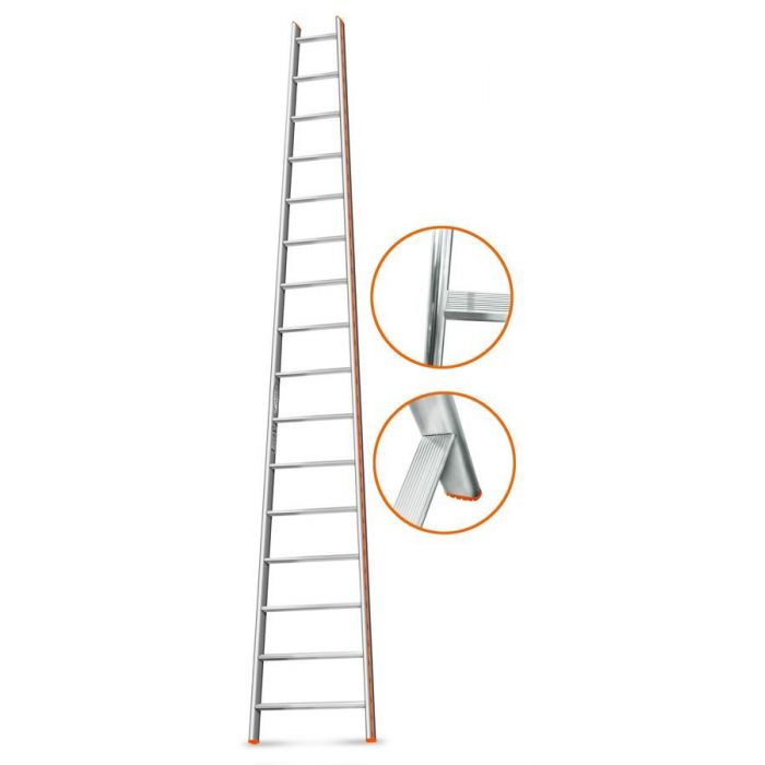 - Ступени выполнены из нескользящего профиля шириной 63 мм с глубокой насечкой. Ступени располагаются строго горизонтально при приведении лестницы в рабочее положение, т.е. расположены под углом к направляющим. Комфортная работа на лестницах с широкими ступенями ощущается при длительной нахождении на высоте.