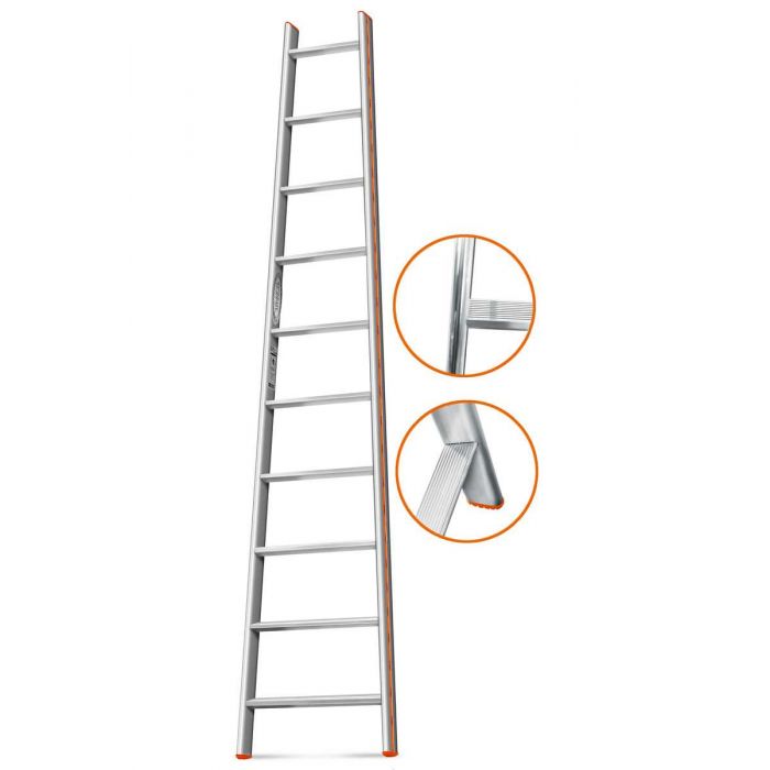 - Ступени выполнены из нескользящего профиля шириной 63 мм с глубокой насечкой. Ступени располагаются строго горизонтально при приведении лестницы в рабочее положение, т.е. расположены под углом к направляющим. Комфортная работа на лестницах с широкими ступенями ощущается при длительной нахождении на высоте.