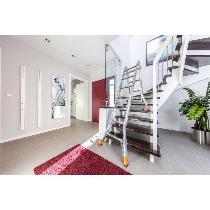 - Телескопическое пошаговое выдвижение наружной части стремянки от перекладины до перекладины позволяет приспособить стремянку к разным условиям работы