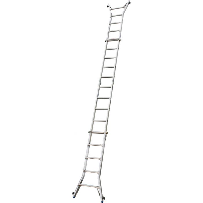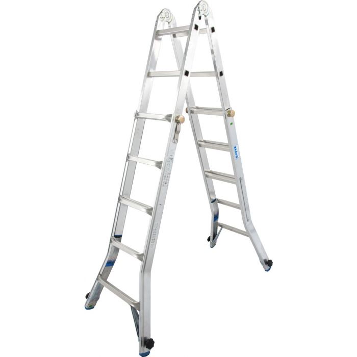 • Четырехсекционная телескопическая алюминиевая шарнирная лестница: применяется как двусторонняя стремянка, как приставная лестница и как две отдельные двусторонние стремянки с 4 встроенными удлинителями стоек (плавное регулирование высоты до 230 м)