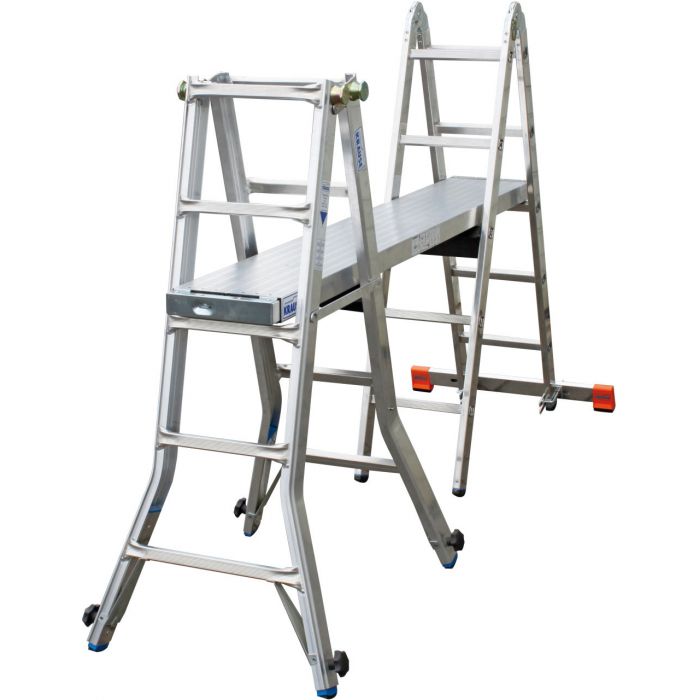 • Из внутренних и наружных секций можно создать две отдельные стремянки, которые с помощью строительных подмостков можно составить в рабочий стол или подставку (примечание: в этом варианте для увеличения опорной площади на внутренней стремянке надлежит использовать комбинированную траверсу арт. № 121417)