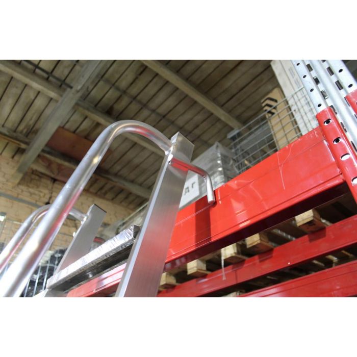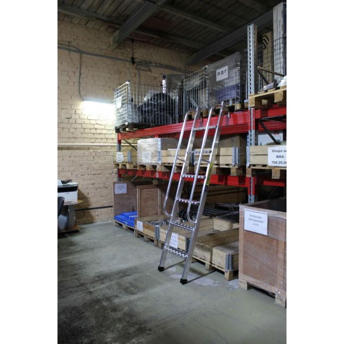- Алюминиевая приставная стеллажная лестница применяется для быстрого доступа к различного уровня стеллажам.