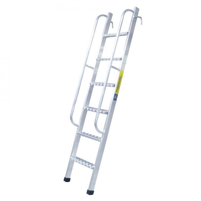 - Верхние части лестницы оборудованы 2 крюками для навешивания используемой лестницы на профильную трубу. Для хранения лестницы имеются дополнительные 2 нижних крюка для навешивания лестницы.