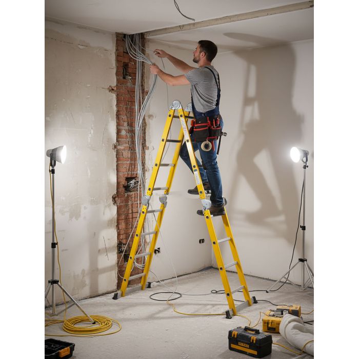 - Диэлектрическая лестница трансформер подойдет для монтажников, электриков.