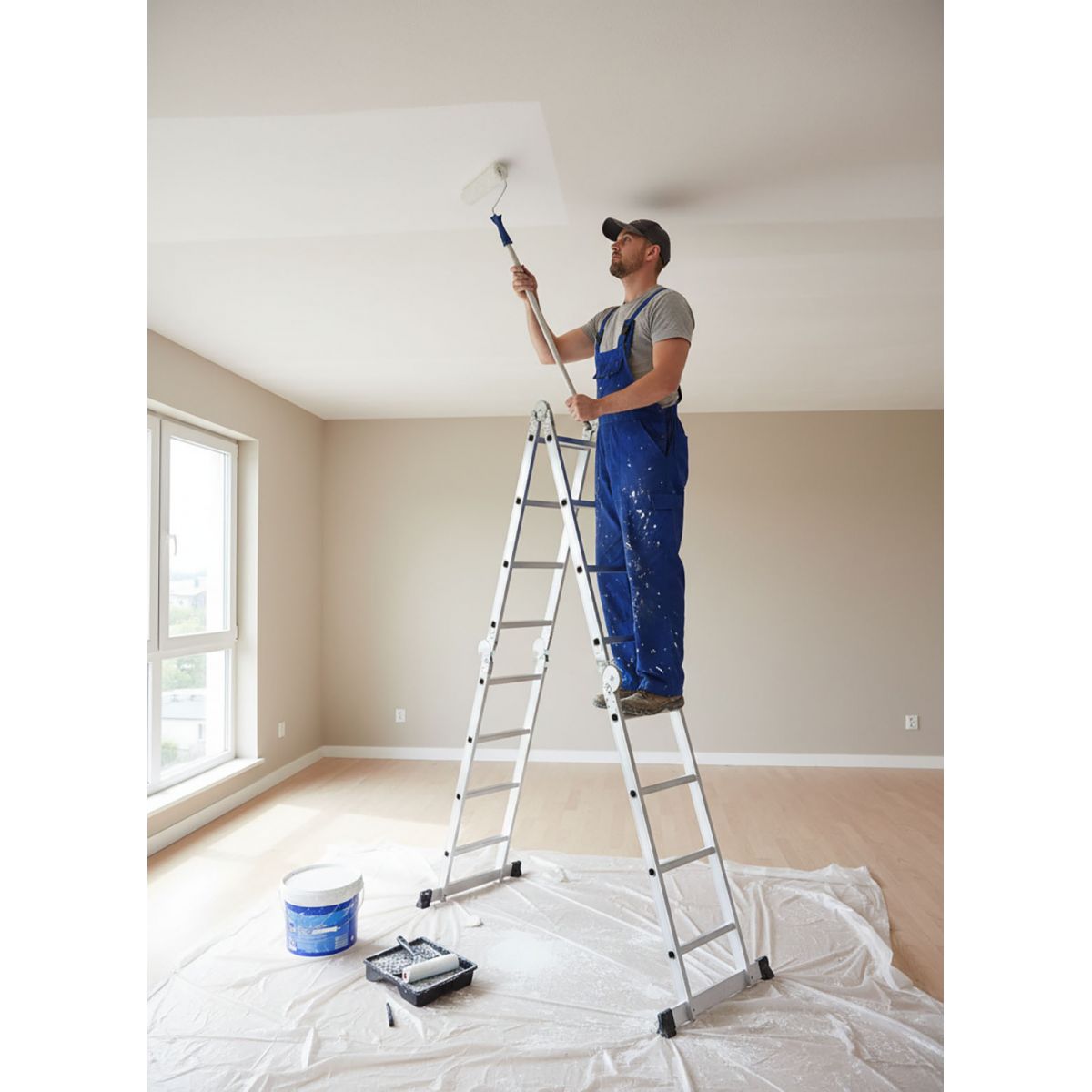 • Может использоваться как стремянка, подмость или приставная лестница, лестница с выносом. При работе в виде подмость желательно использовать настил и максимальная статическая нагрузка не должна превышать 100 кг.