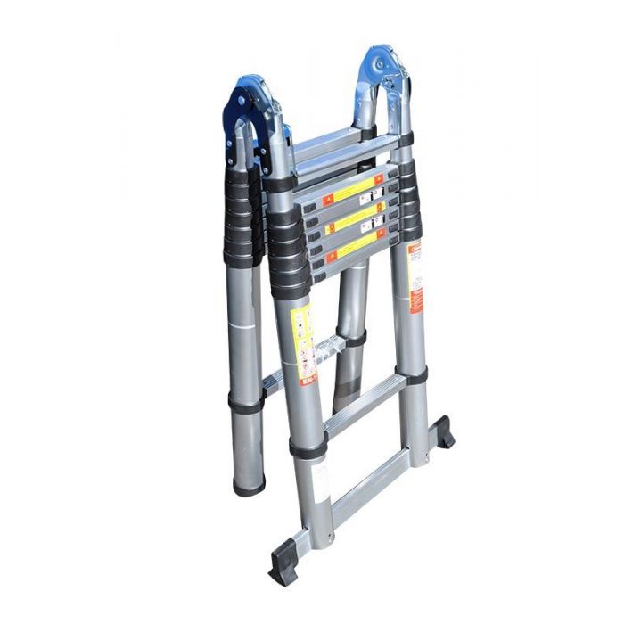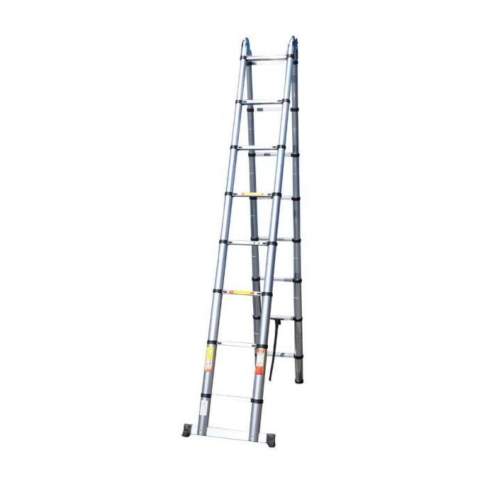 - Алюминиевая лестница используется как стремянка с двусторонним подъемом. Стальной шарнир фиксирует лестницу в двух положениях.