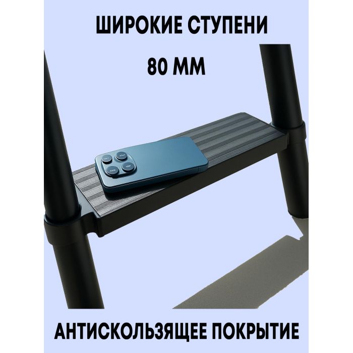 • Удобство использования: Разложить лестницу на необходимую длину и сложить обратно можно легко и быстро, нажав на два лепестка на ступенях.