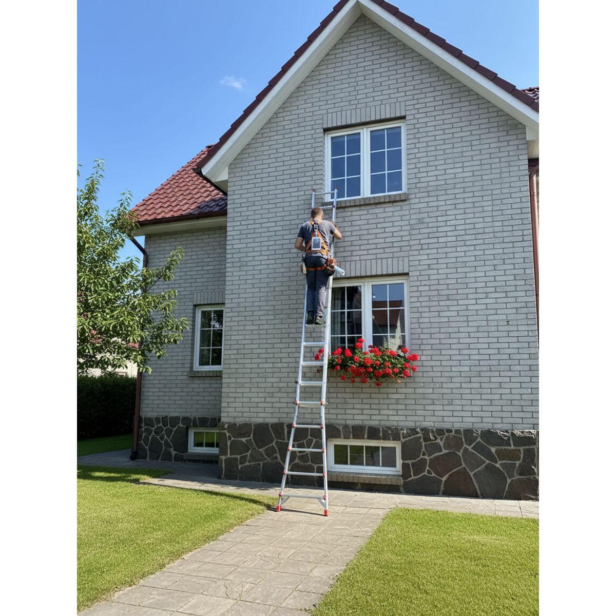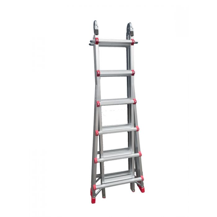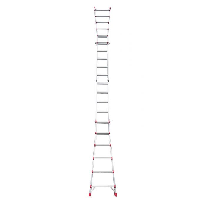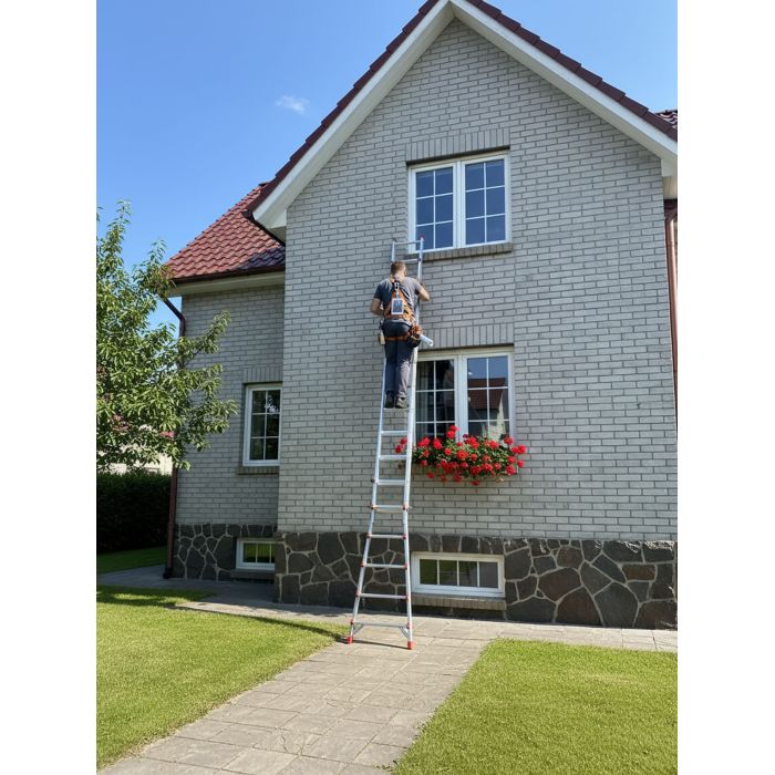 Лестница состоит из 4 телескопических секций по 6 ступеней каждая, что позволяет использовать её как приставную лестницу или как стремянку. Дюралюминиевые подпружиненные замки надёжно фиксируют каждую секцию на выбранном уровне, обеспечивая безопасность работ. Поступенчатая регулировка высоты — ключевая особенность модели: вы можете выдвинуть каждую секцию независимо, адаптируя длину лестницы под конкретные условия.