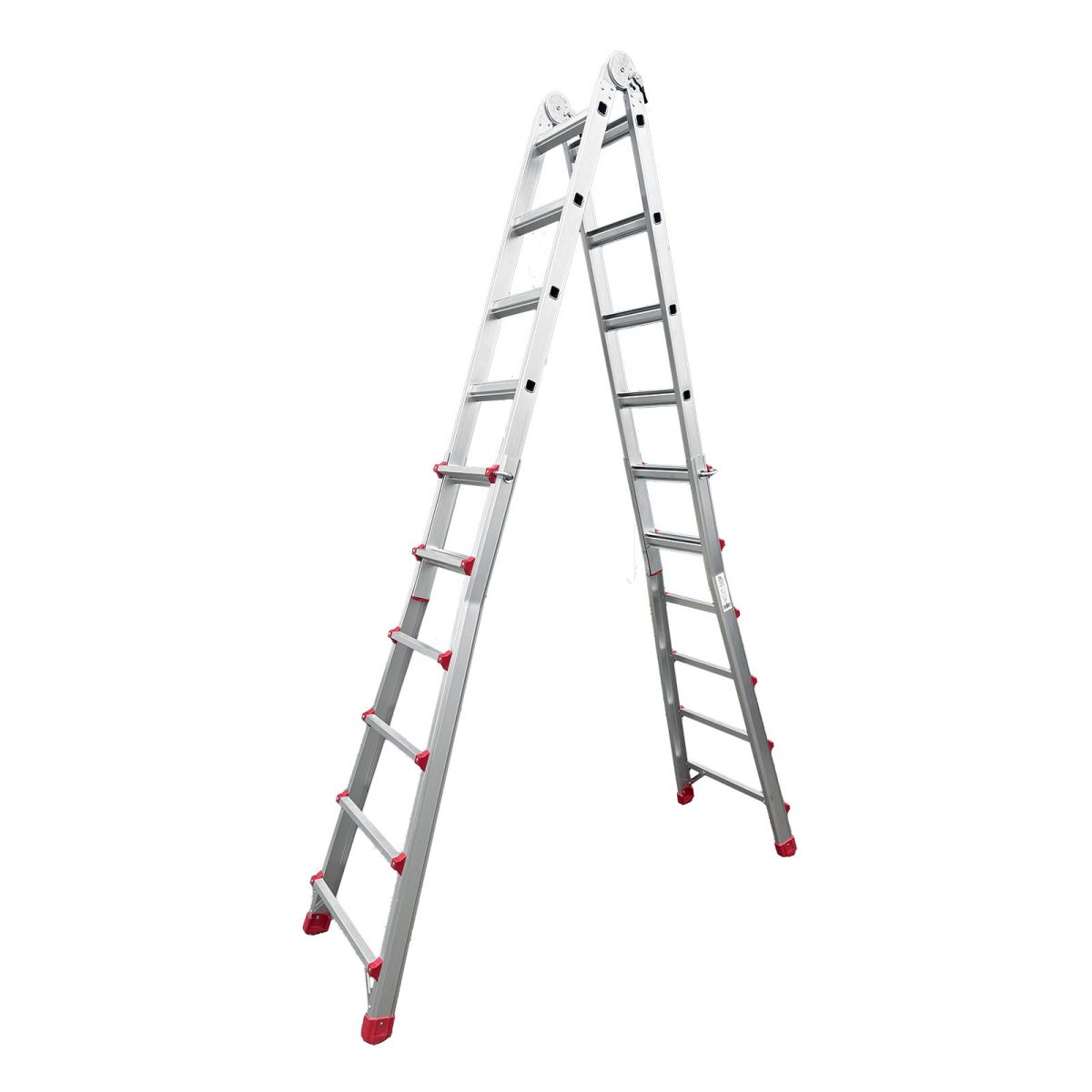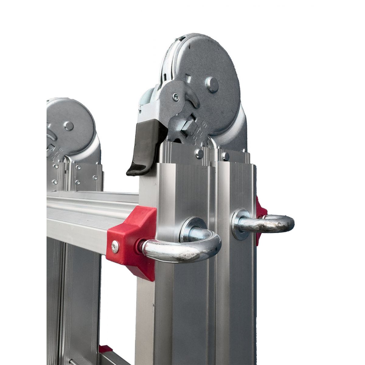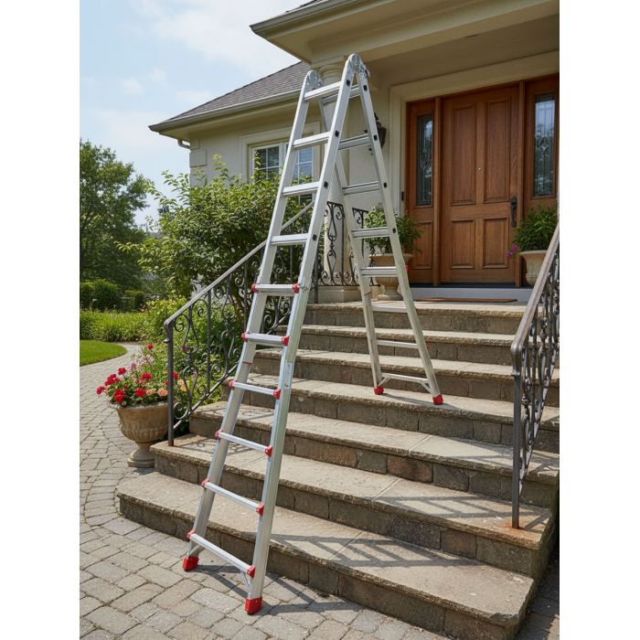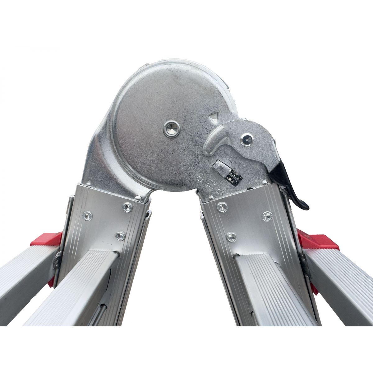 Два больших стальных шарнира позволяют зафиксировать лестницу в трёх положениях: вертикально (приставная позиция), под углом для работы на маршах и в особом положении для работы на перепадах высот. Это означает, что нижняя и верхняя части лестницы опираются на разные уровни пола, создавая уникальное преимущество при ремонте и монтажных работах в сложных геометриях помещений.
