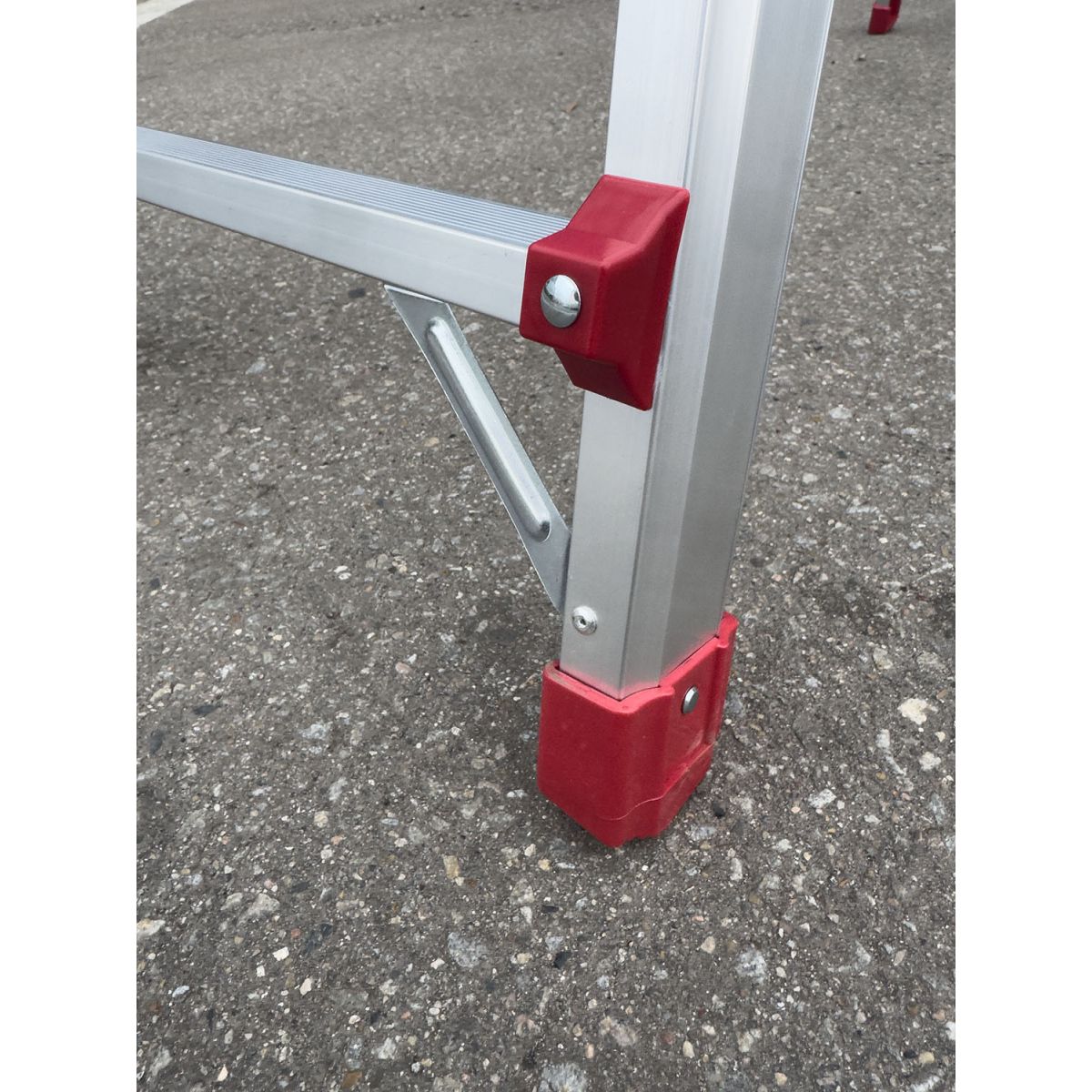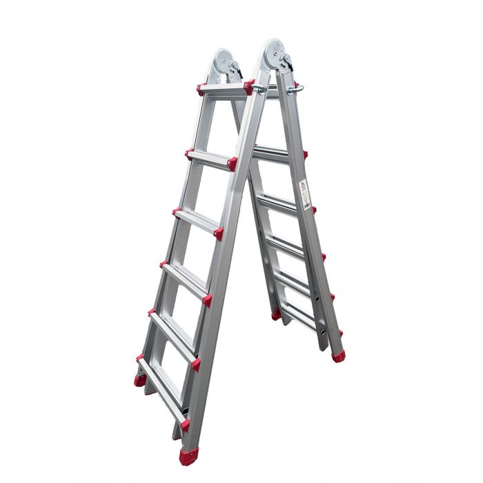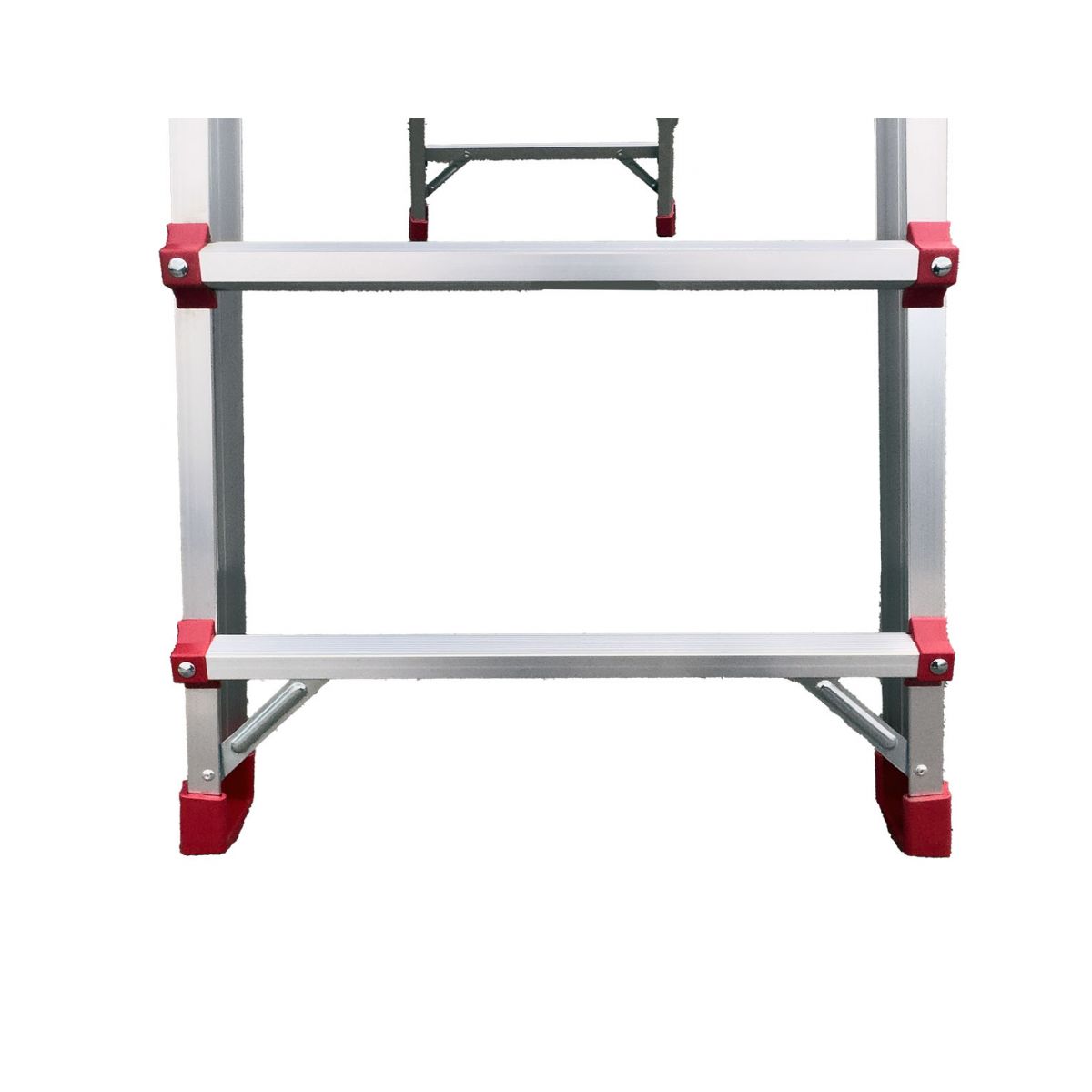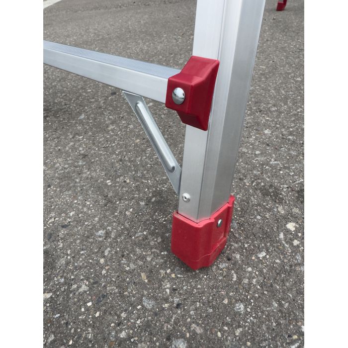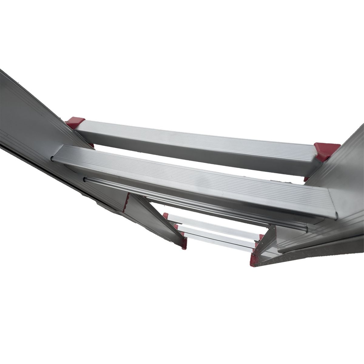 Два больших стальных шарнира позволяют зафиксировать лестницу в трёх положениях: вертикально (приставная позиция), под углом для работы на маршах и в особом положении для работы на перепадах высот. Это означает, что нижняя и верхняя части лестницы опираются на разные уровни пола, создавая уникальное преимущество при ремонте и монтажных работах в сложных геометриях помещений.