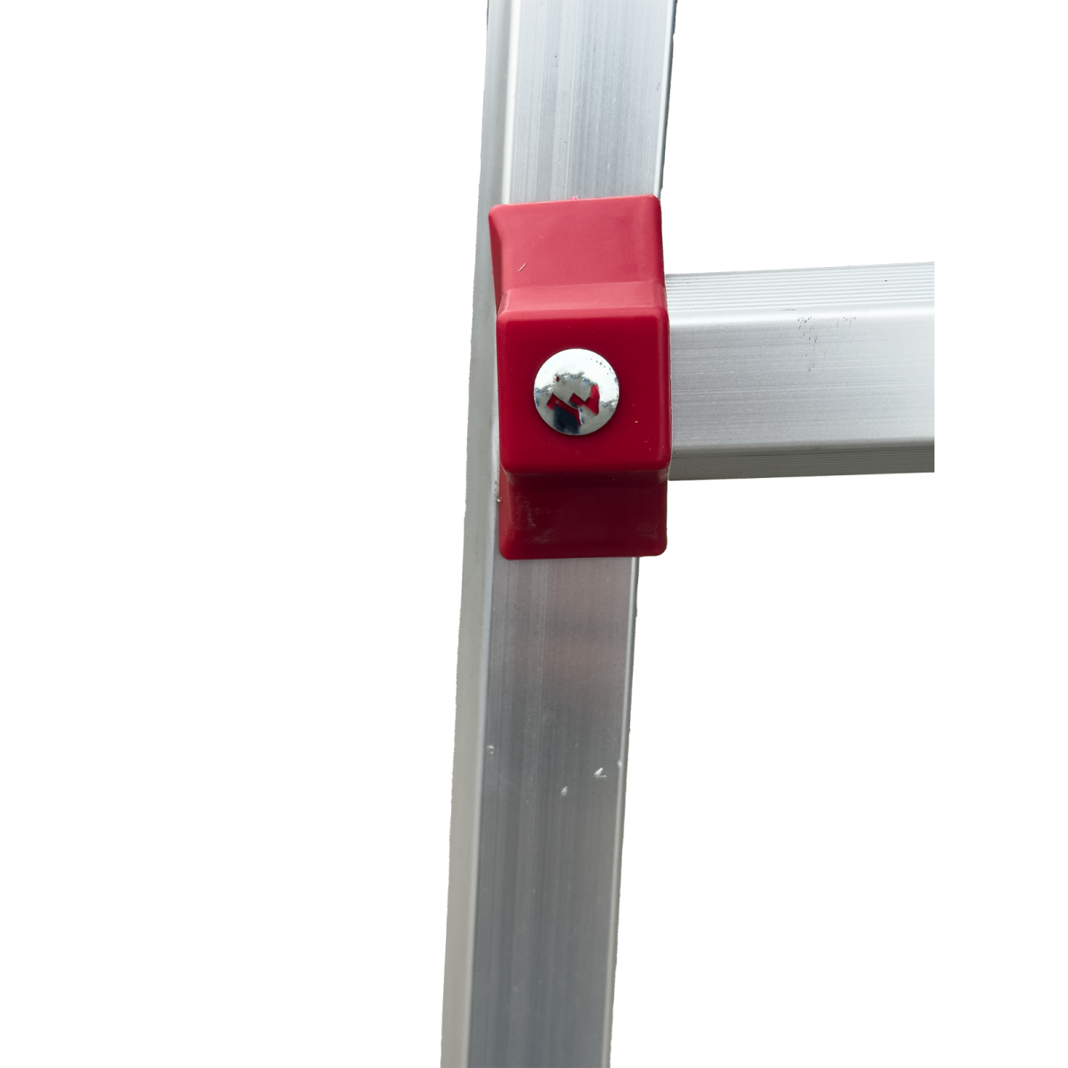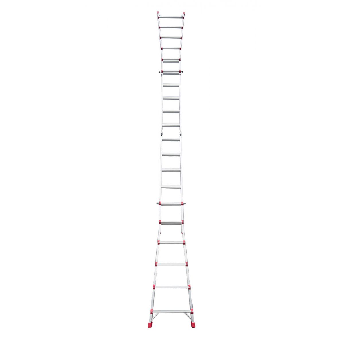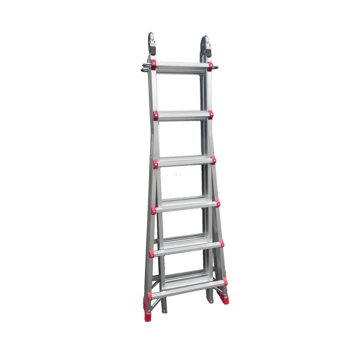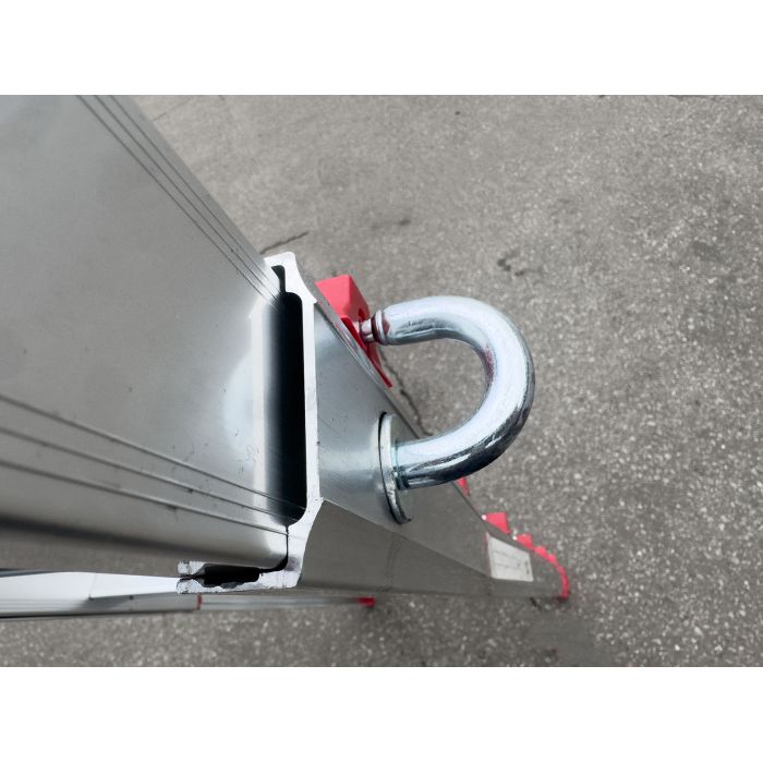 Два больших стальных шарнира позволяют зафиксировать лестницу в трёх положениях: вертикально (приставная позиция), под углом для работы на маршах и в особом положении для работы на перепадах высот. Это означает, что нижняя и верхняя части лестницы опираются на разные уровни пола, создавая уникальное преимущество при ремонте и монтажных работах в сложных геометриях помещений.