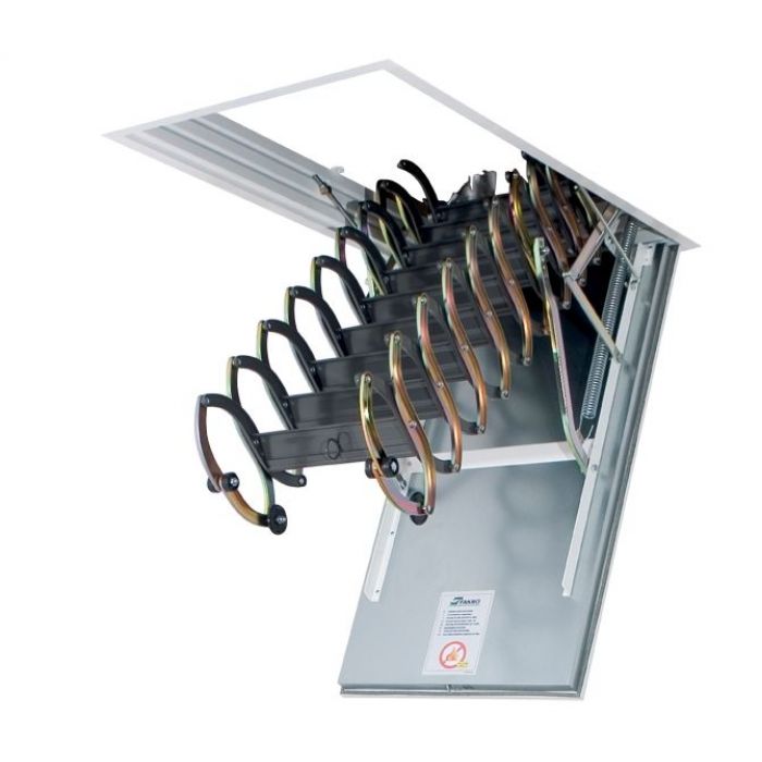 Благодаря «ножничной» системе складывания в сложенном виде лестница LSF очень компактна, и соответственно имеет небольшой размер крышки люка. Максимальная допустимая нагрузка для лестницы составляет 250 кг, что дает возможность удобно и безопасно переносить на чердак тяжелые предметы. Специальный механизм регулировки угла открывания крышки люка позволяет подогнать высоту лестницы под высоту потолка. Лестница предназначена к установке в помещениях с высотой потолка 320 см, дополнительная секция позволяет увеличить высоту лестницы.