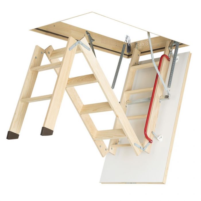 Складная чердачная лестница LWK состоит из трех секций, которые компактно складываются и «хранятся в потолке». Для большего удобства и безопасности эксплуатации лестница оснащена боковым металлическим поручнем, а пластиковые наконечники (кроме лестниц с высотой 335 см и моделей длиной 94 см) предохраняют поверхность пола от повреждения и увеличивают устойчивость конструкции. Утепленная крышка люка облицована ДВП белого цвета, что делает ее практически незаметной при установке в светлом или белом потолке.