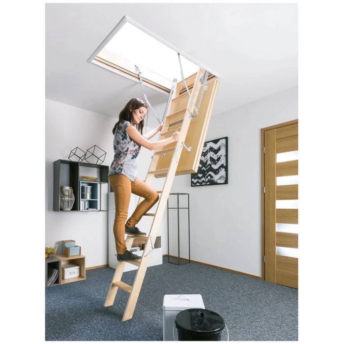 Деревянная чердачная лестница LWS Plus состоит из четырех секций, которые компактно складываются и «хранятся в потолке». Древесный цвет крышки люка идеально вписывается в потолок, обшитый вагонкой. Соединение тетивы боковых элементов и ступеней лестницы в крепление «ласточкин хвост» гарантирует надежность и прочность конструкции.