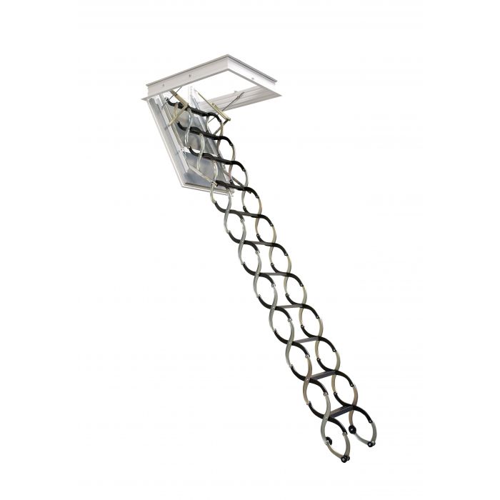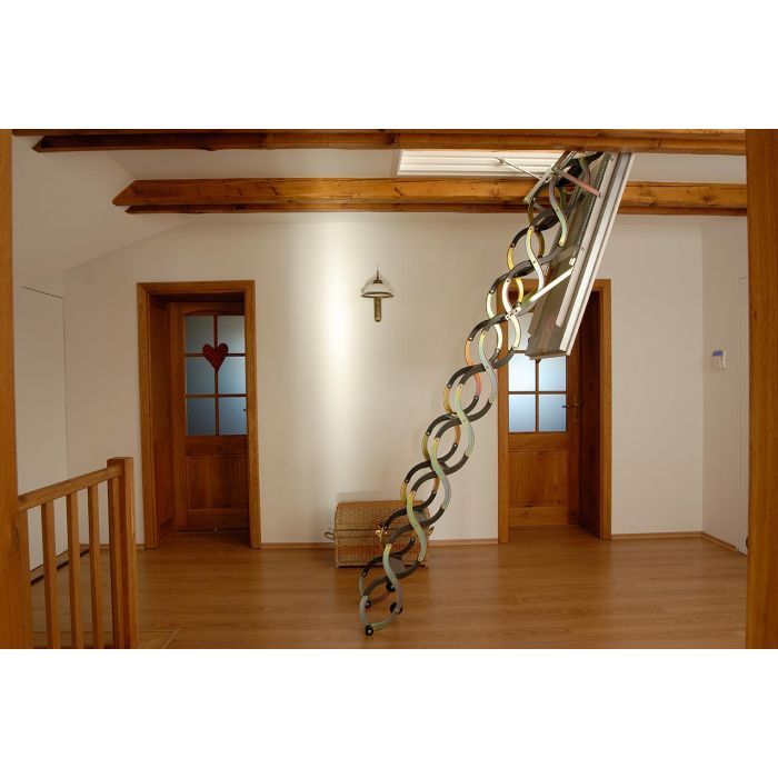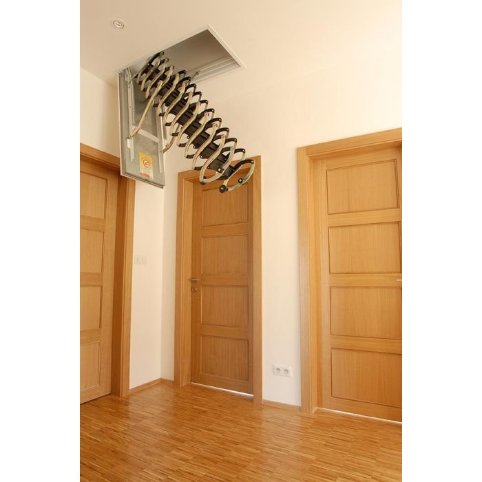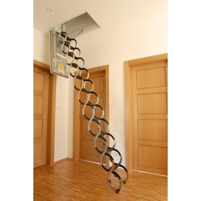 Раздвижная металлическая чердачная лестница, работает по типу сжатия.