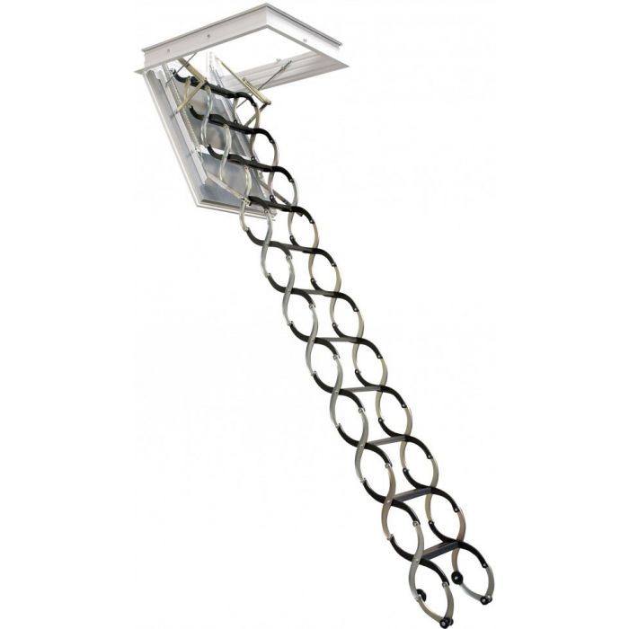 Раздвижная металлическая чердачная лестница, работает по типу сжатия.