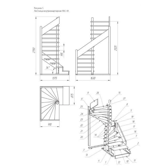Материал: колонна центральная и уголки крепления ступеней к тетивам — сталь; ступени, опорные столбы, тетивы — древесина (сосна).