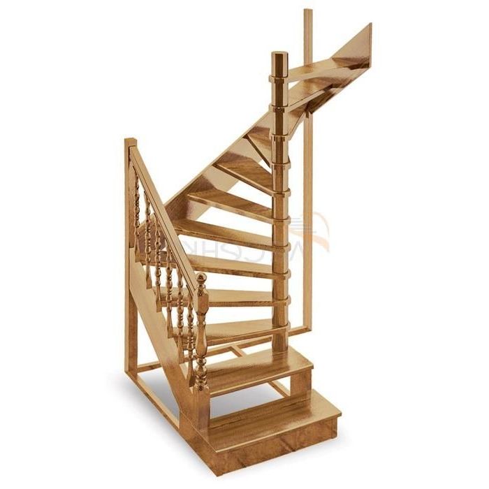Материал: колонна центральная и уголки крепления ступеней к тетивам — сталь; ступени, опорные столбы, тетивы, поручни и балясины — древесина (сосна).