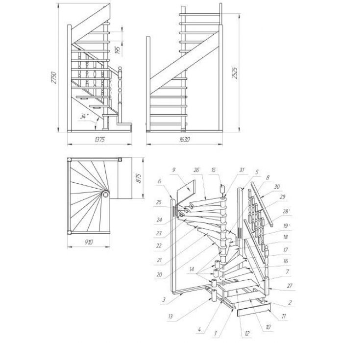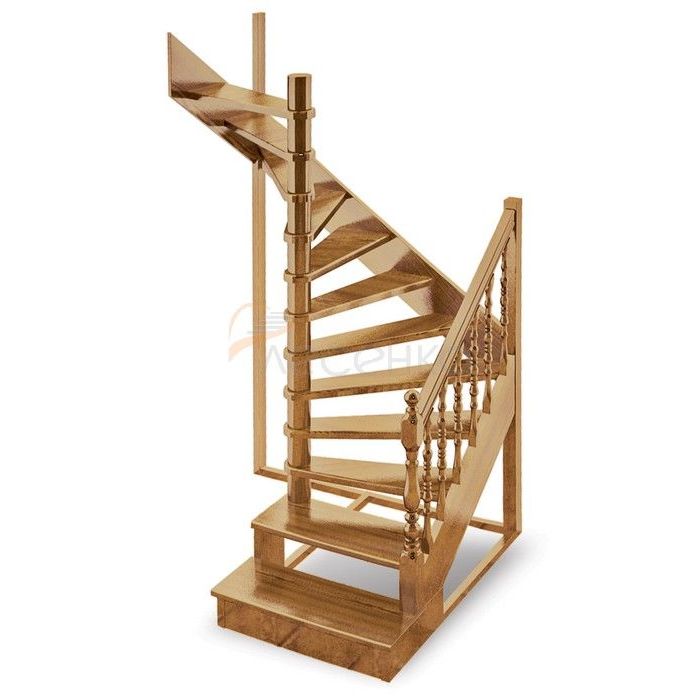 Материал: колонна центральная и уголки крепления ступеней к тетивам — сталь; ступени, опорные столбы, тетивы, поручни и балясины — древесина (сосна).