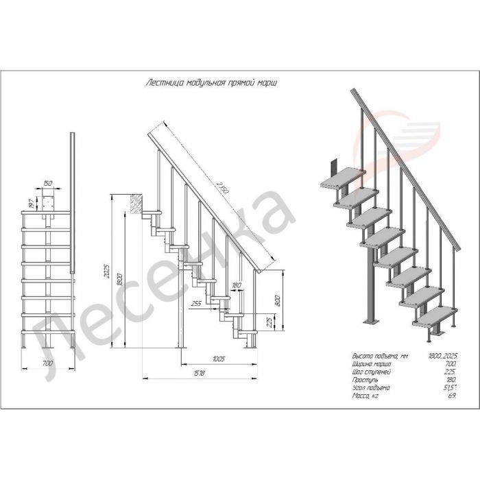 • Высота лестницы от 1800 до 3375 мм