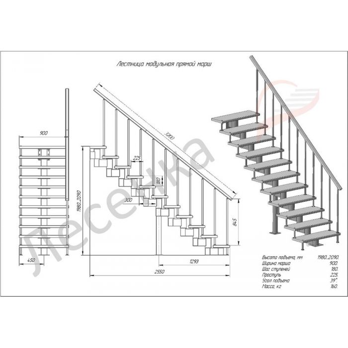 Межэтажная модульная лестница Стандарт прямой марш высота шага 225 мм
