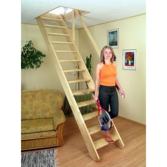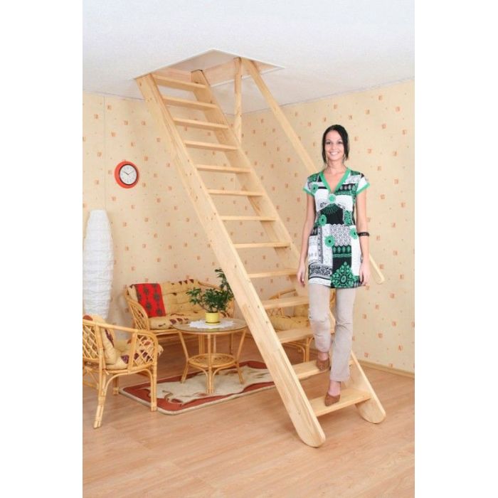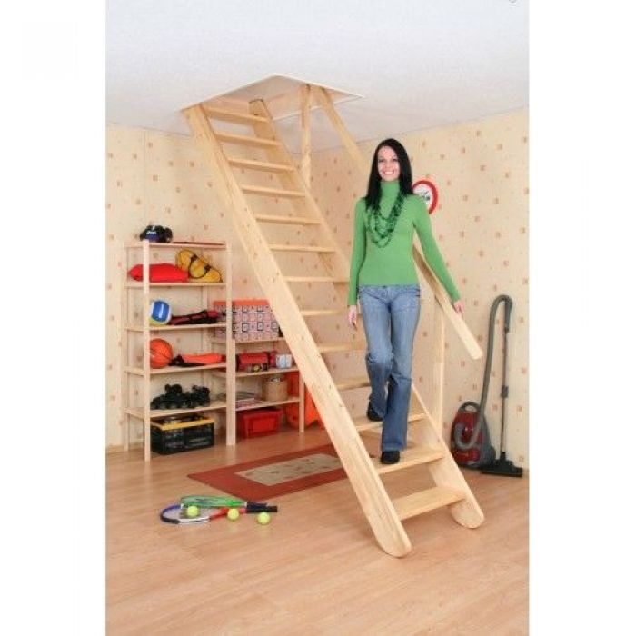 - Лестница занимает мало места и имеет угол наклона 52°. Ступени лестницы прямые.