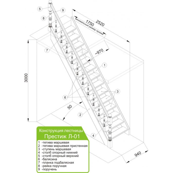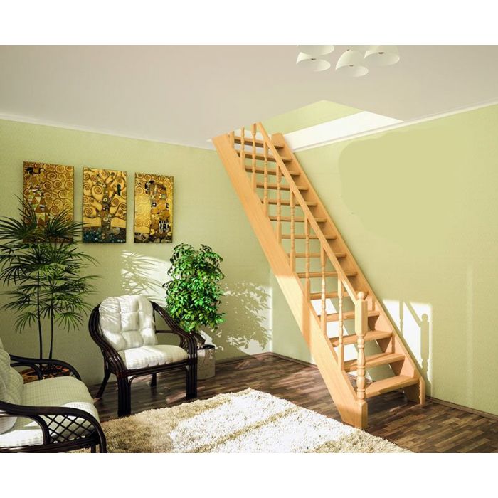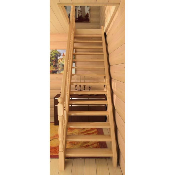 Лестница - прямая тяжелая одномаршевая. Комплектуется перилами, резными балясинами и резными столбами. Лестница на 2-й этаж изготовлена из хвойных пород дерева, легко подвергается дополнительной обработке (нанесению лака, краски, декоративных рисунков).