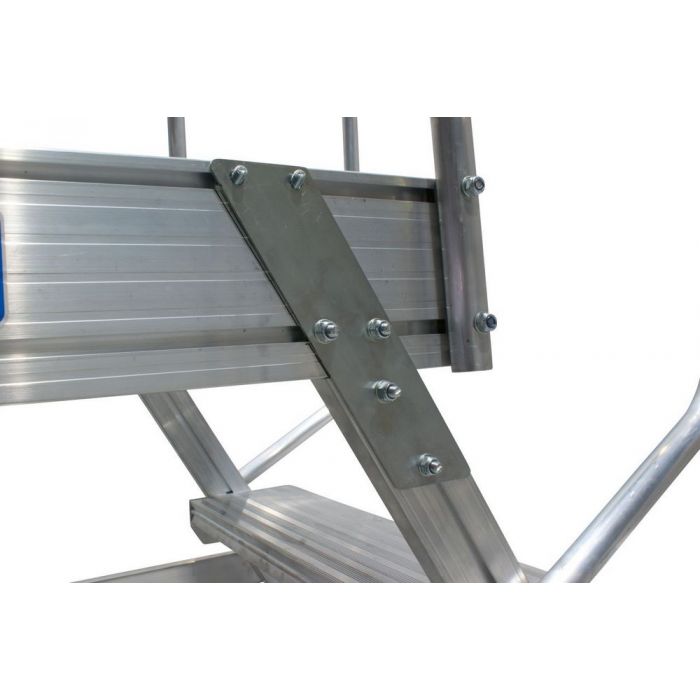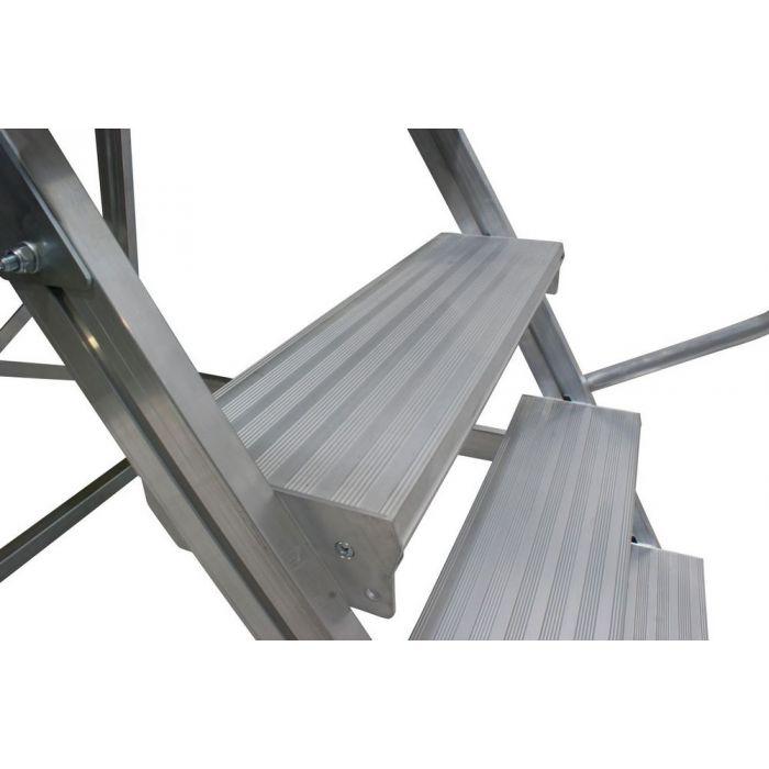• Широкие ступени из алюминия, двусторонние перила и трёхстороннее ограждение площадки.