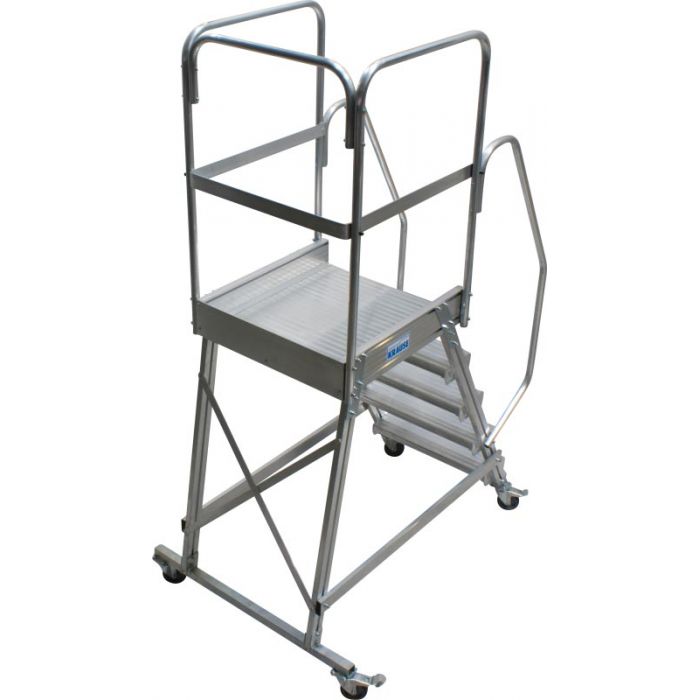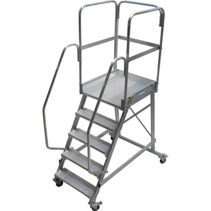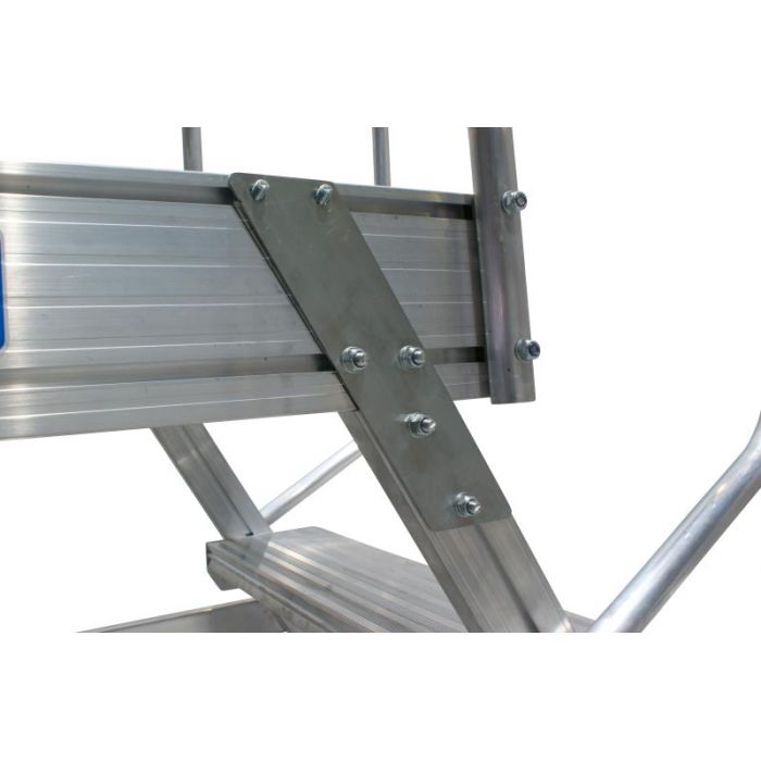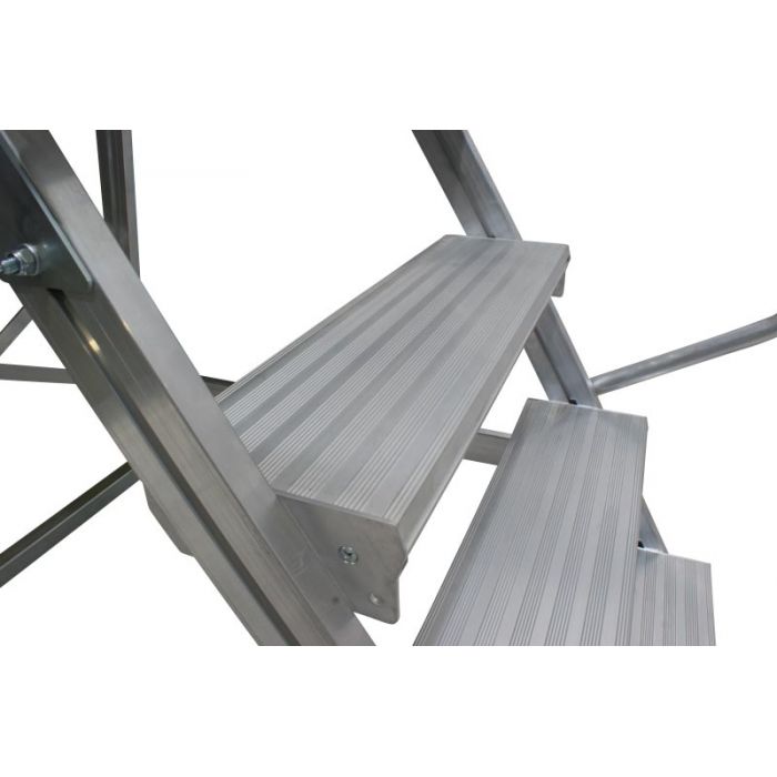 - Широкие ступени из алюминия, двусторонние перила и трёхсторонее ограждение площадки.