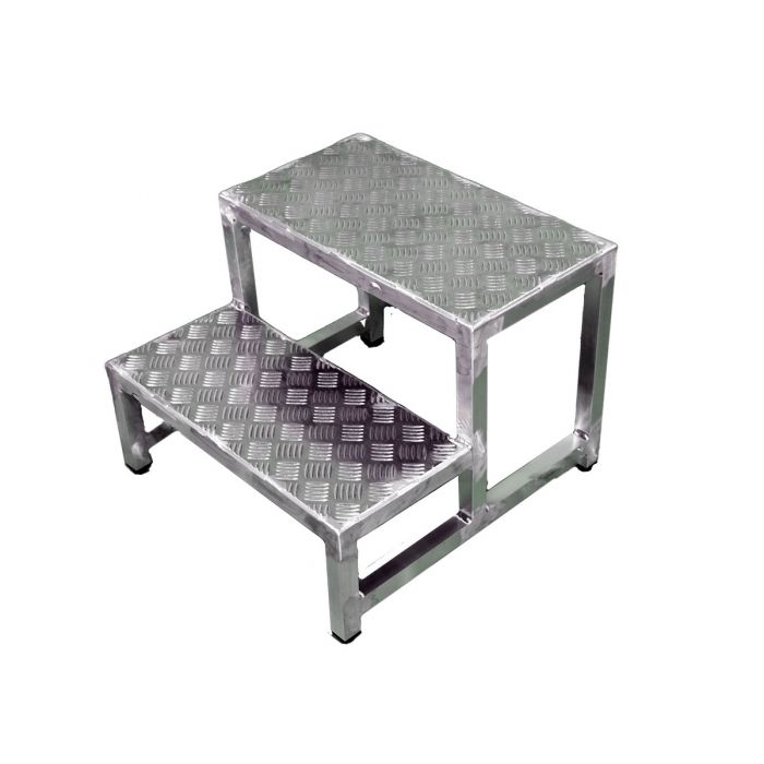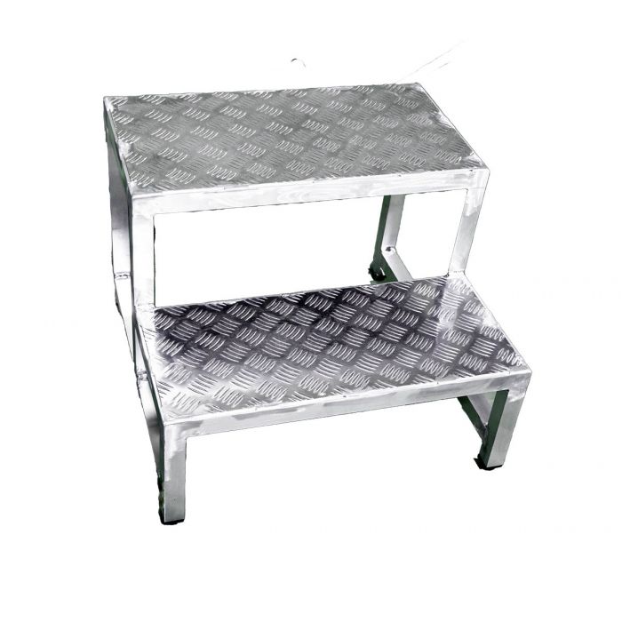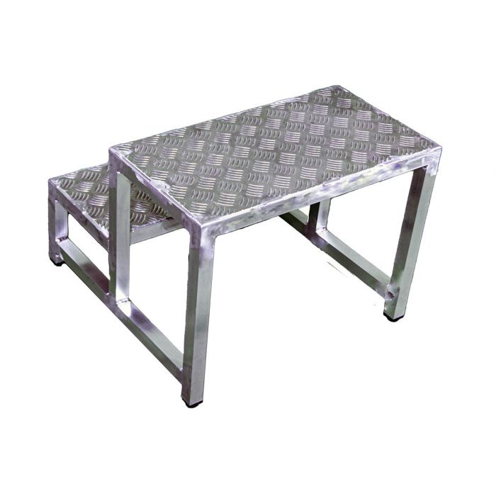 - Подставка представляет собой прочную цельносварную конструкцию из алюминия, состоящую из ступеней шириной 250 мм, изготовленных из рифленого алюминиевого листа. Это обеспечивает безопасность подъема и удобство в работе.
