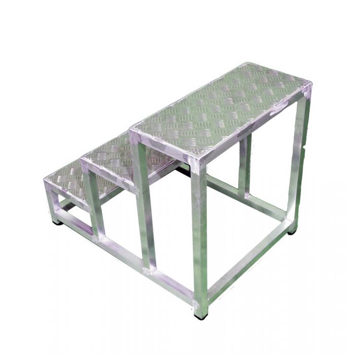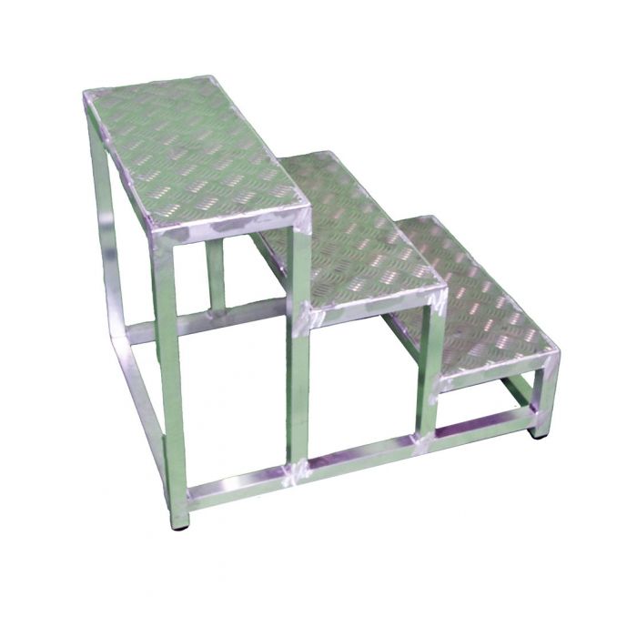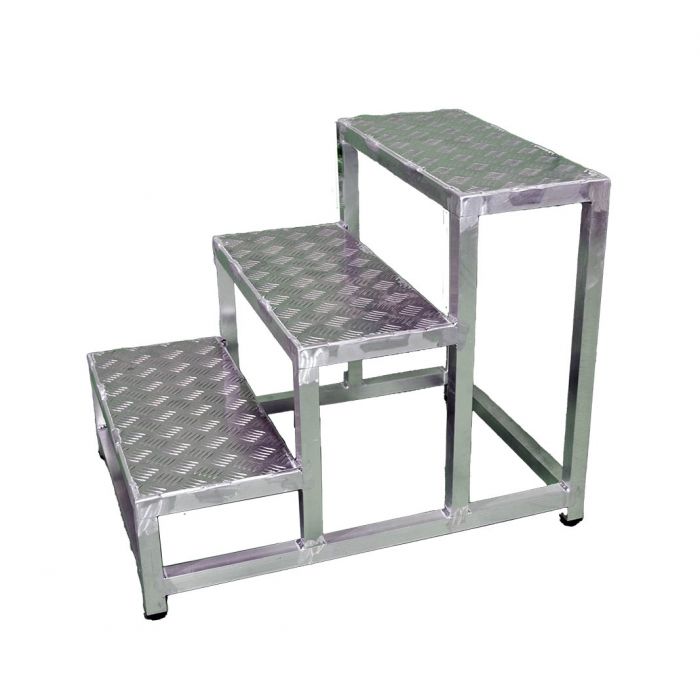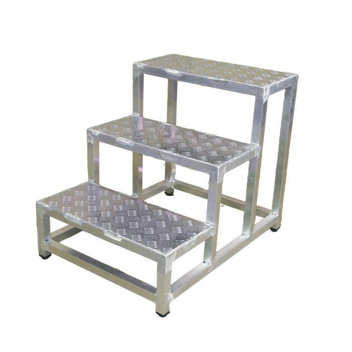 - Подставка представляет собой прочную цельносварную конструкцию из алюминия, состоящую из ступеней шириной 250 мм, изготовленных из рифленого алюминиевого листа. Это обеспечивает безопасность подъема и удобство в работе.