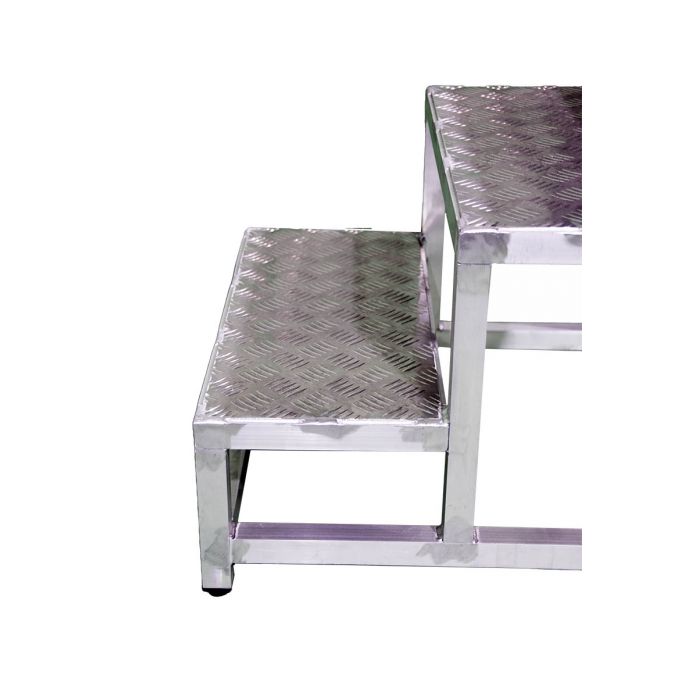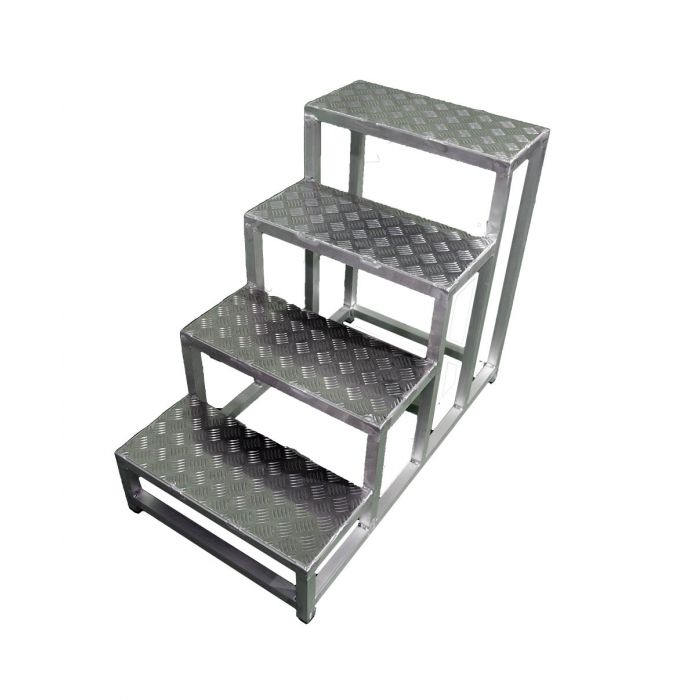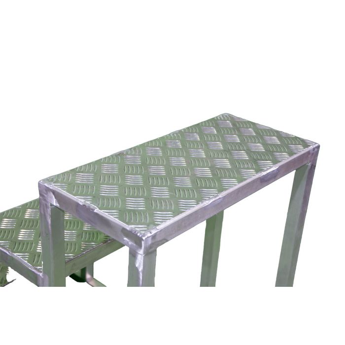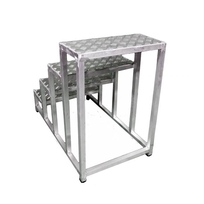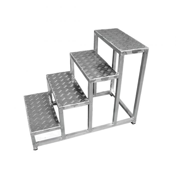 - Подставка представляет собой прочную цельносварную конструкцию из алюминия, состоящую из ступеней шириной 250 мм, изготовленных из рифленого алюминиевого листа. Это обеспечивает безопасность подъема и удобство в работе.