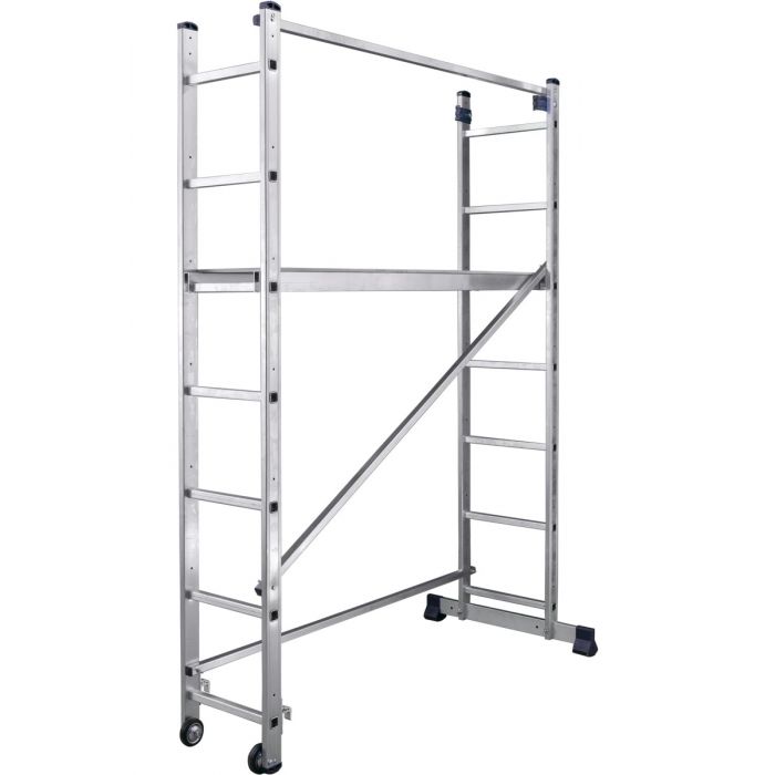 Лестница-помост представляет собой сборно-разборную алюминиевую конструкцию башенного типа. Основными элементами являются две параллельные лестницы (секции), соединенные жесткими прямыми и диагональными опорами, что гарантирует устойчивость и безопасность в процессе работы. На концах секций установлены стабилизаторы — широкие планки с противоскользящими опорами, которые предотвращают опрокидывание, что особенно важно при использовании лестницы на неровных поверхностях.