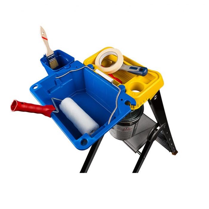 - Большая пластмассовая полочка-ротационная (занимает мало места, легко заменяется): 4 больших ячейки для инструментов, 2 специальных отверстия для прохода проводов, 2 ячейки для отверток, мерная шкала, крюк для ведра