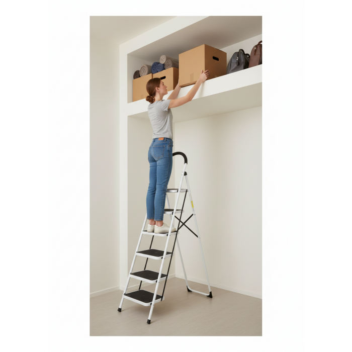- Удобство использования: оснащена удобной ручкой высотой 33 см, покрытой мягким материалом, что делает её использование комфортным. Стремянка также может использоваться как стул благодаря продуманному дизайну.