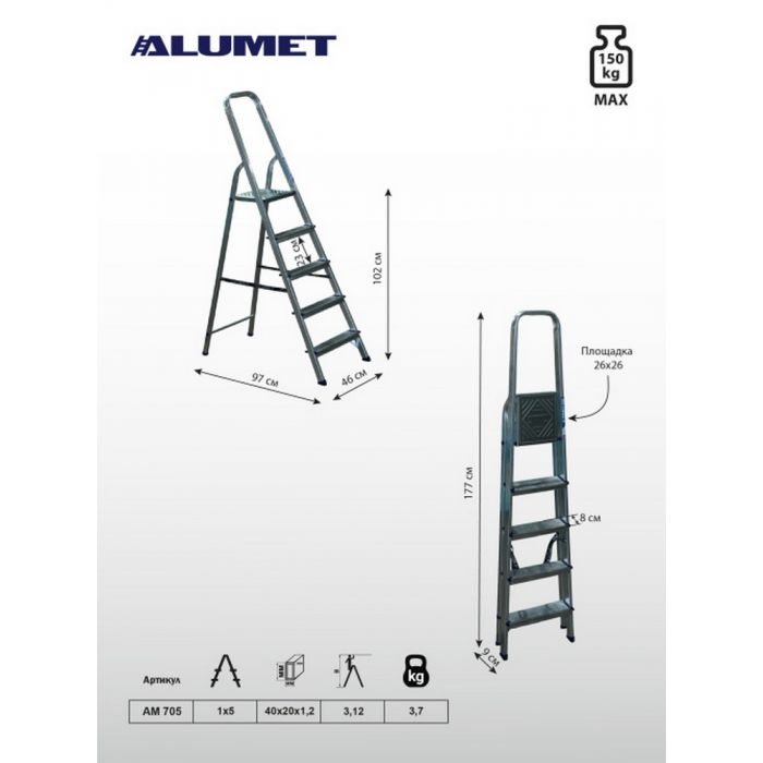 Посмотреть другие размеры алюминиевых стремянок Алюмет серии АМ можно здесь.