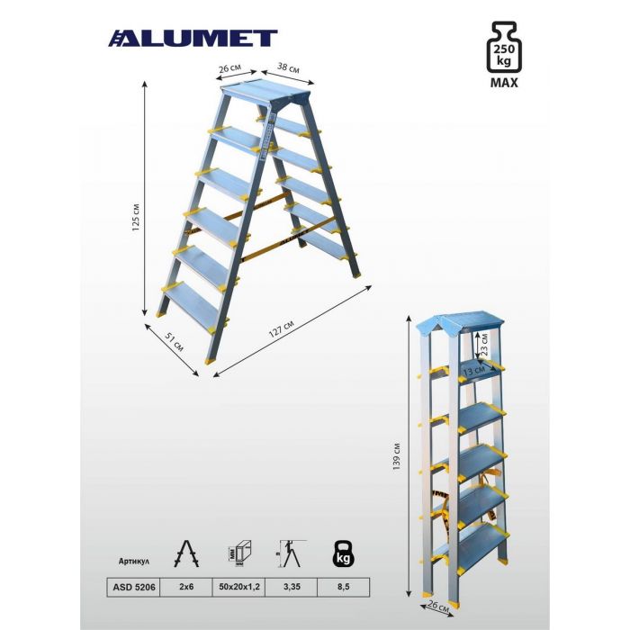Стремянка Alumet ASD 5206 — оптимальный выбор для тех, кто ищет сочетание качества, безопасности и удобства. Благодаря своим характеристикам она подходит как для профессионального использования, так и для выполнения домашних задач. Выбирайте Alumet ASD 5206 и работайте с комфортом!