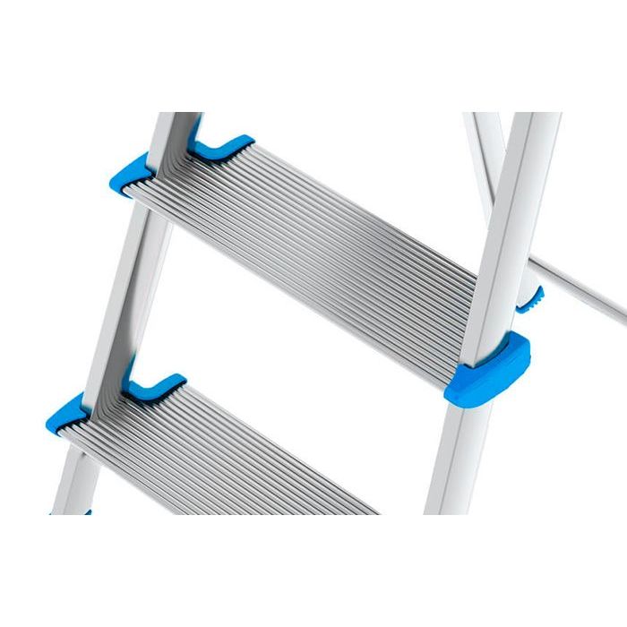 - Профессиональная стремянка с широкими рифлеными ступенями шириной 12 см. которые надежно завальцованы в направляющие.