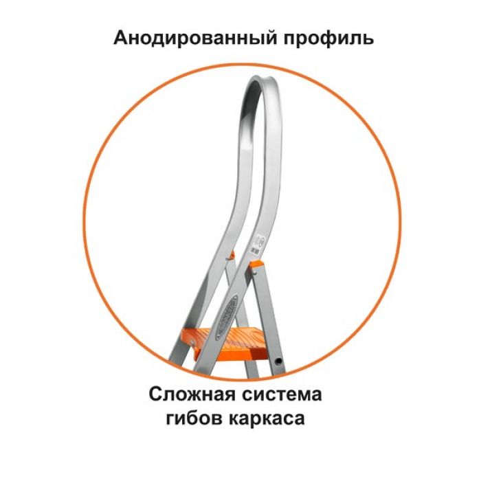 - Стремянка выполнена из оригинального восьмигранного АНОДИРОВАННОГО алюминиевого профиля размером 50х20 мм., оставляющего чистыми руки, имеющего несколько гибов передней и задней секции. Это позволило создать идеальные форму и механизм складывания.