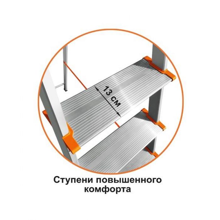 - Широкие рифленые ступени 130 мм повышенного комфорта для длительной работы надежно приклепаны к стойкам – «двойная клепка» – и защищены пластиковыми заглушками.
