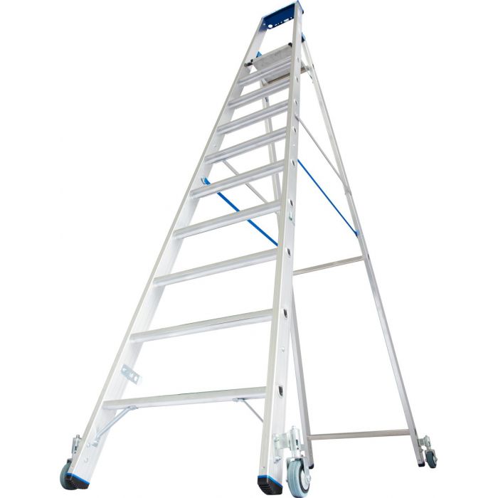 - Передвижная односторонняя алюминиевая стремянка с 4 самоблокирующимися роликами 80 мм, с автоматикой „Roll/Stop" для профессионального применения в стесненных условиях