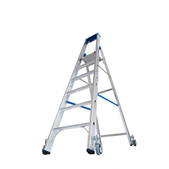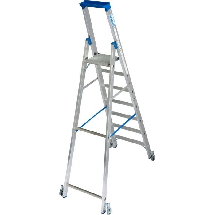 - Передвижная односторонняя алюминиевая стремянка с 4 самоблокирующимися роликами 80 мм, с автоматикой „Roll/Stop" для профессионального применения в стесненных условиях