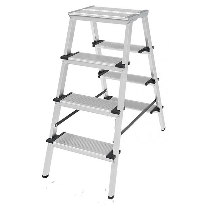 - Ориентация ступеней на обе стороны позволяет работать, не переставляя стремянку и тем самым экономя время