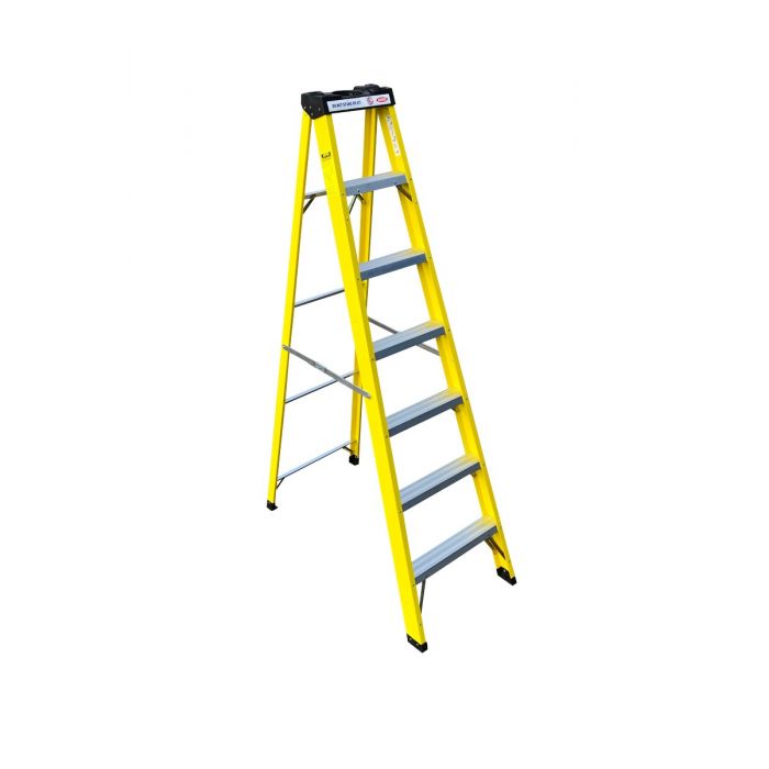 Стремянка фиберглассовая SevenBerg 6 ступеней — надёжное решение для безопасных работ на высоте с электрооборудованием, высоковольтными сетями и в сложных условиях. Изготовлена из прочного фиберглассового П-образного профиля жёлтого цвета (1-я секция 78×30 мм, 2-я — 45×30 мм, толщина 4 мм). Материал полностью соответствует требованиям безопасности и обладает всеми диэлектрическими свойствами, позволяя использовать её как стремянка изолирующая при работе с электросетями повышенного и высокого напряжения.