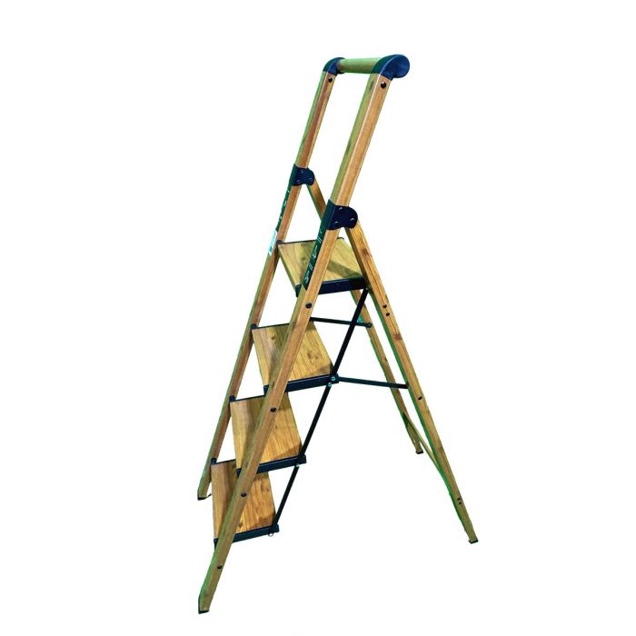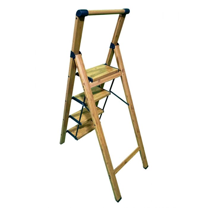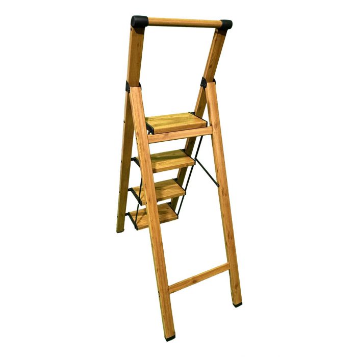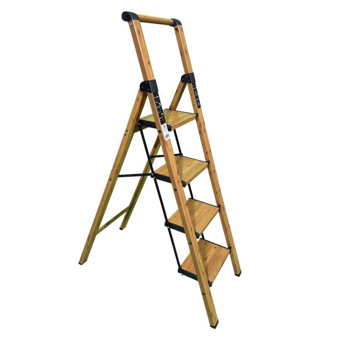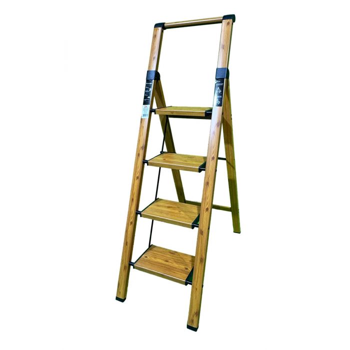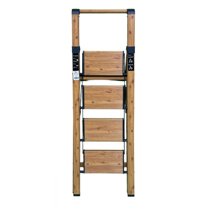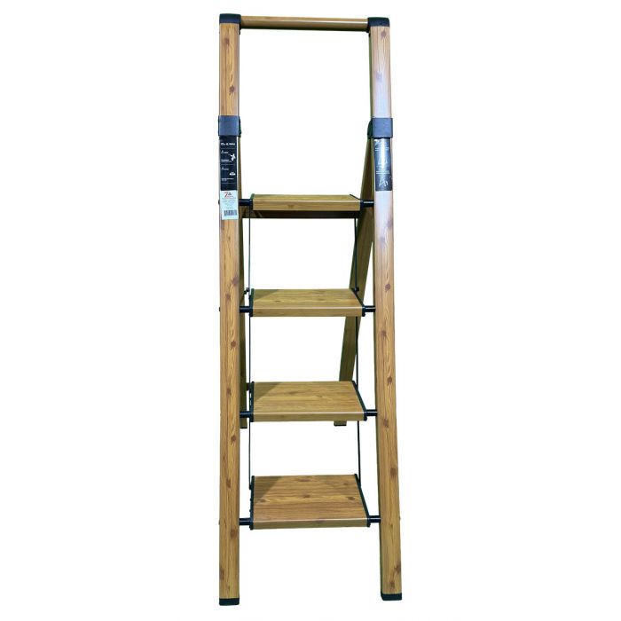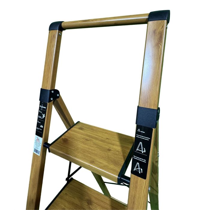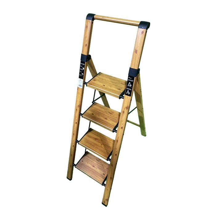 Изготовленная из алюминиевого сплава, стремянка покрыта специальным материалом, имитирующим цвет дерева, что придает ей эстетичный вид. Боковины имеют размеры 40х25 мм и толщину 1 мм, а их полукруглая форма придаёт конструкции изящество. Широкие алюминиевые ступени размером 29х18 см оснащены рифлёной поверхностью, что обеспечивает надёжное сцепление и предотвращает скольжение во время работы.