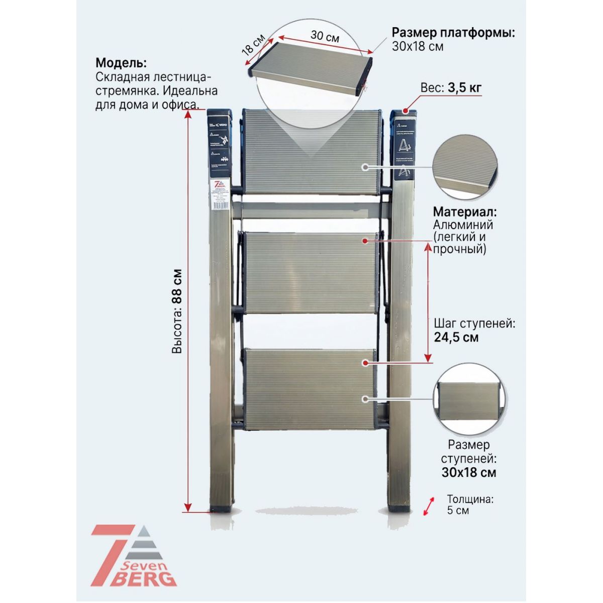Стремянка SevenBerg Milano создана для тех, кто ценит устойчивость и комфорт. Усиленный алюминиевый профиль боковин (45x25 мм, толщина 1 мм) гарантирует жесткость конструкции, а максимальная нагрузка до 150 кг позволяет работать пользователям любой комплектации.