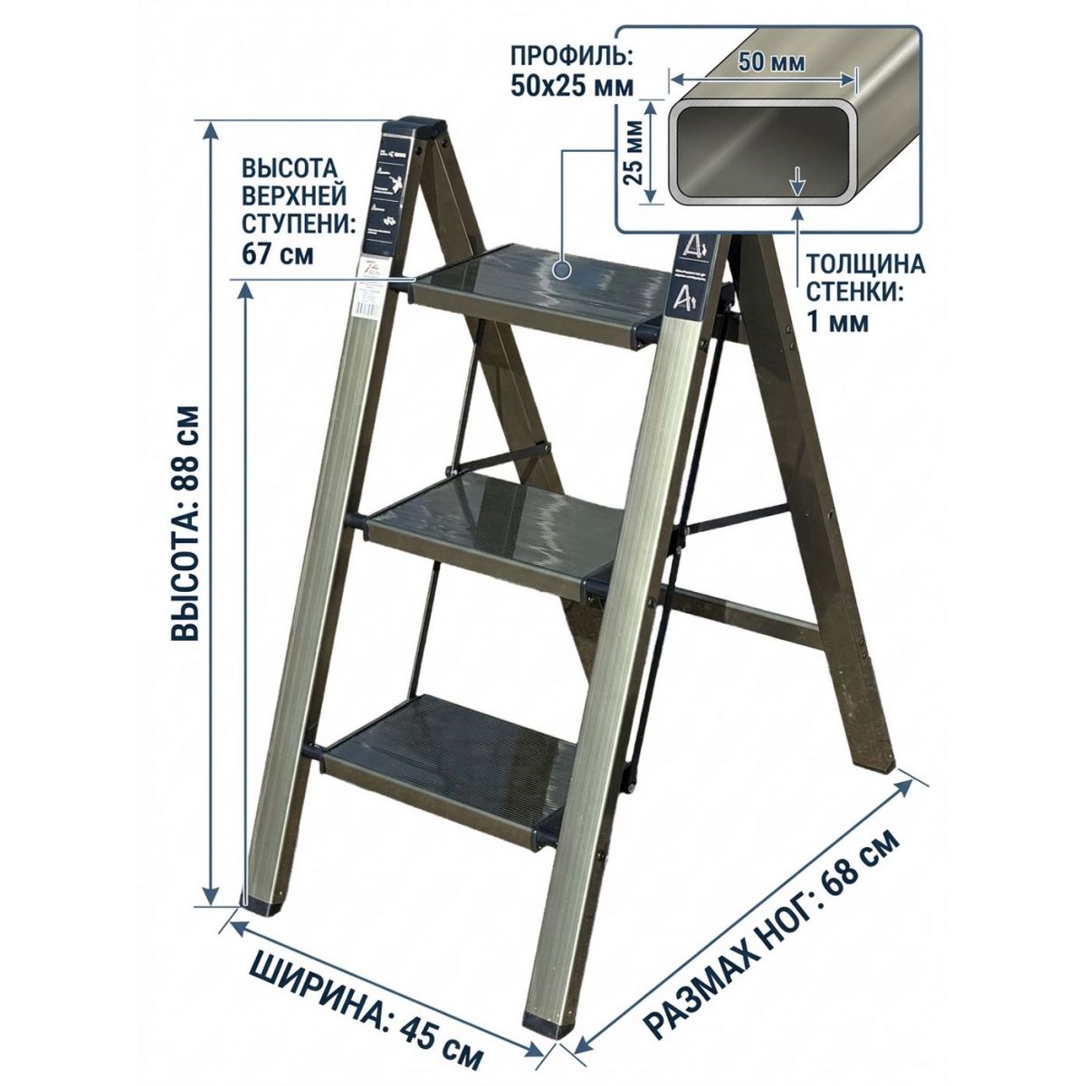 - Работа на любой высоте: Все ступени имеют одинаковый размер, поэтому можно уверенно стоять на любой из них.