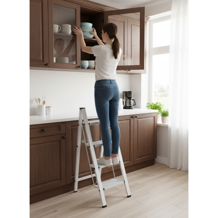 Стремянка с широкой ступенью, очень устойчивая и лёгкая, можно применять в быту, ремонте и на других повседневных работах. Имеет современный стиль и подойдёт в интерьер квартиры, оформленной как в современном стиле, так и в классическом.